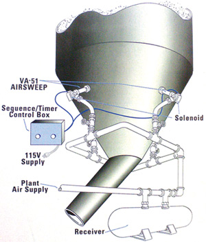 A typical Airsweep system consists of strategically-located Airsweeps, high-flow solenoid valves, electronic sequence controller and air receiver.